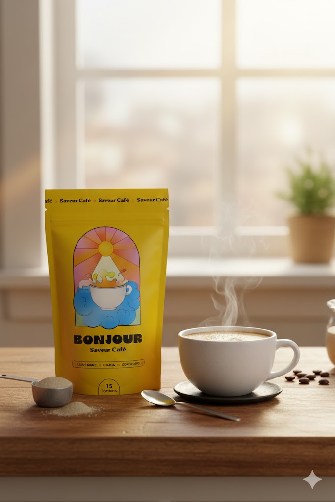 Le Bonjour Drink est une boisson fonctionnelle inspirée du café, formulée à partir d’ingrédients soigneusement sélectionnés pour leurs bienfaits. Contrairement au café traditionnel, il apporte une énergie progressive, sans nervosité ni chute brutale.