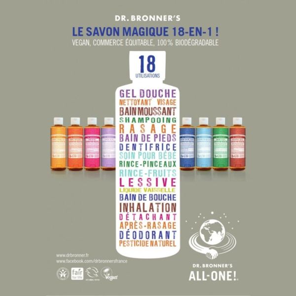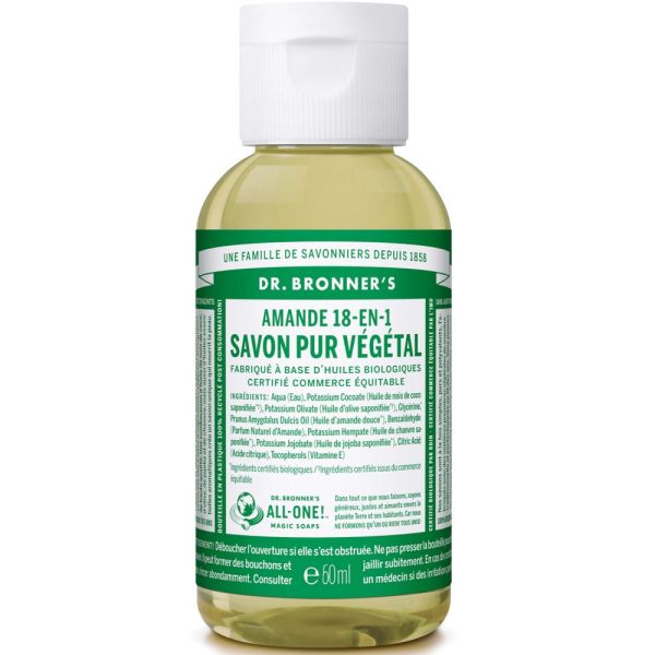 Eau, huile de coco saponifiée*+, huile d’olive saponifiée*+, glycérine (issue de la saponification des huiles végétales), huile de chanvre saponifiée*+, huile de jojoba saponifiée*, huile d’amande douce*, benzaldéhyde naturel, acide citrique de tapioca, tocophérols naturels (vitamine E)