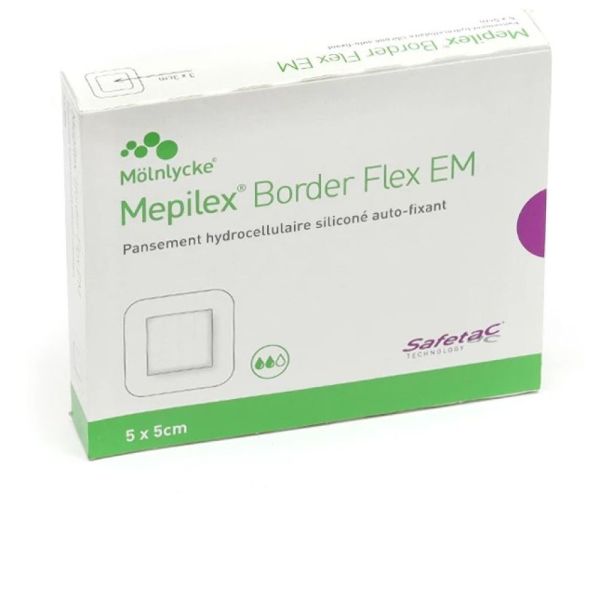 Le pansement hydrocellulaire Mepilex Border Flex EM dispose d'une enduction de silicone qui provient de l'interface Safetac et qui permet un retrait atraumatique et sans douleur et qui prévient la macération.